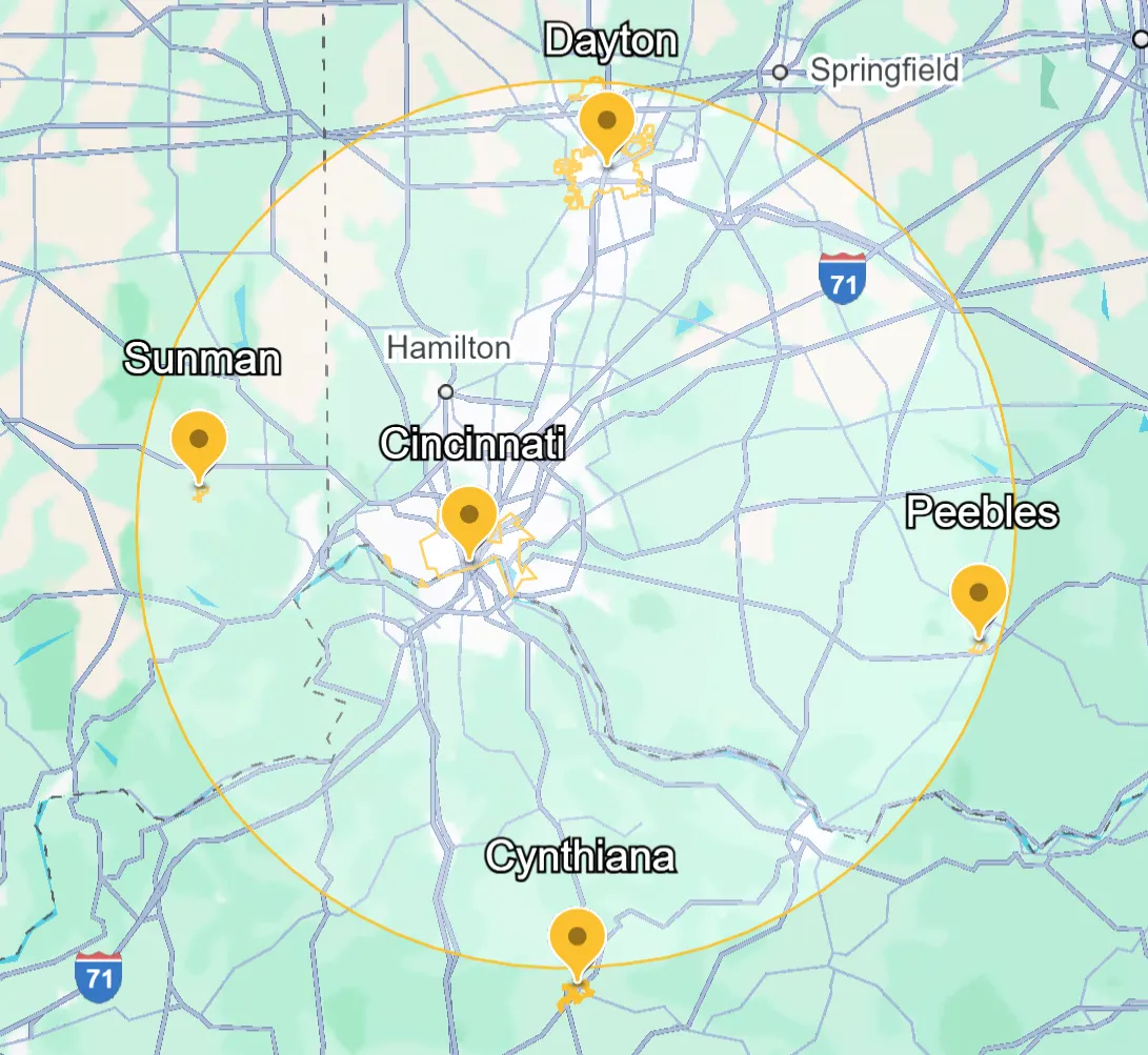Serving: We proudly serve 50 miles around Milford, OH, stretching north to Dayton, OH, south to Cynthiana, KY, west to Sunman, IN, and east to Peebles, OH. Not sure if you're in our service area? Call us!